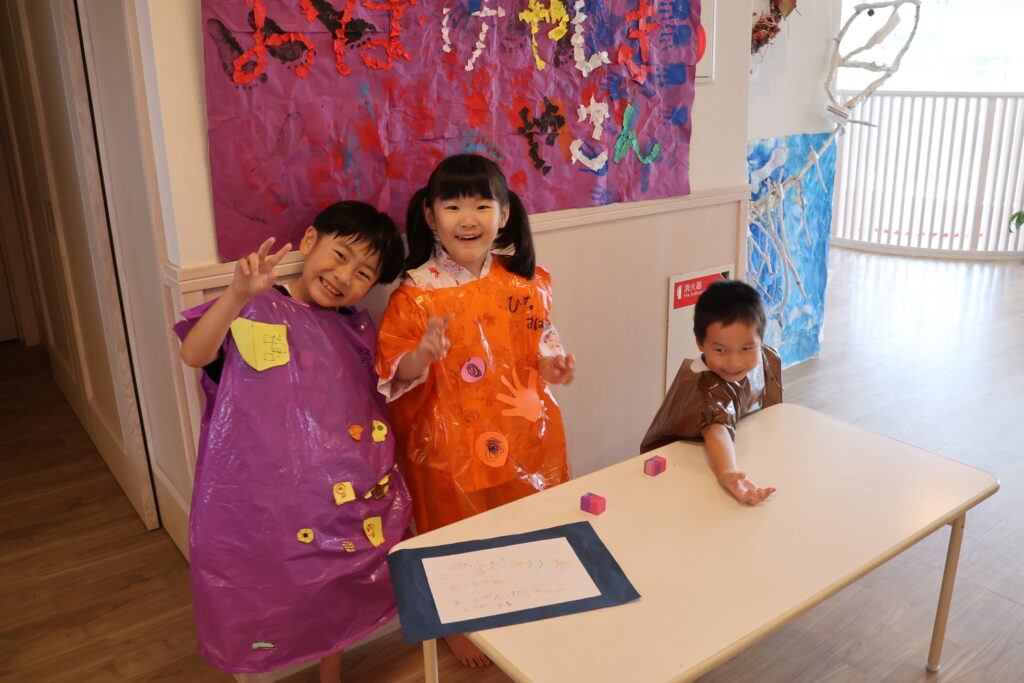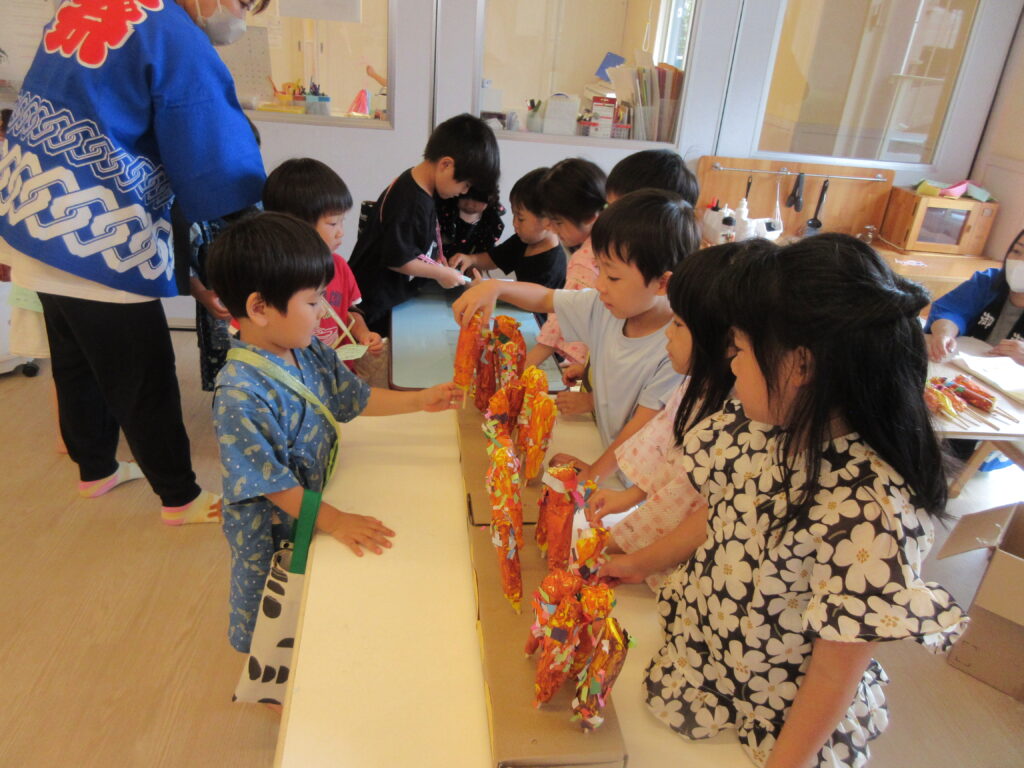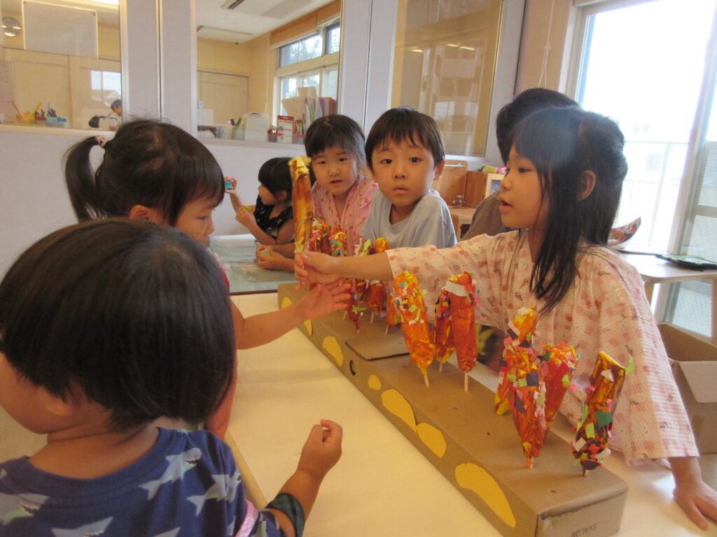 4.5歳児たちが自分たちで決め、長い時間をかけて準備してきたお店屋さんは、どれも工夫がされており、お店屋さんもお客さんもみんなが笑顔の楽しい夏祭りとなりました。