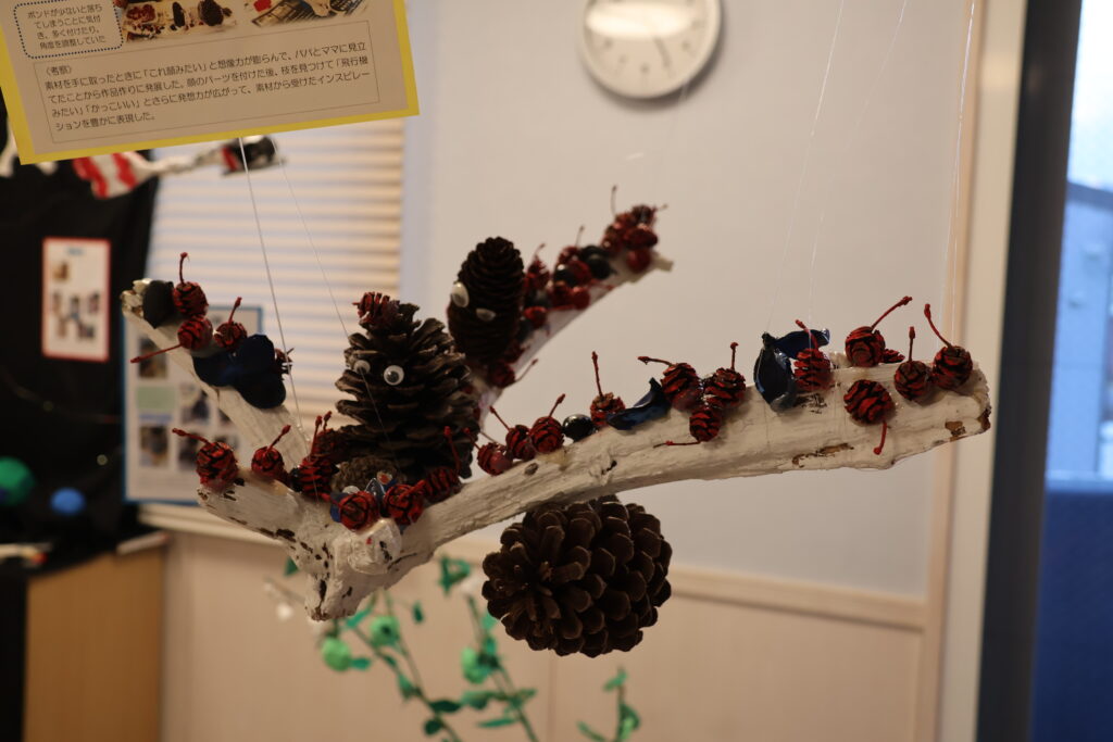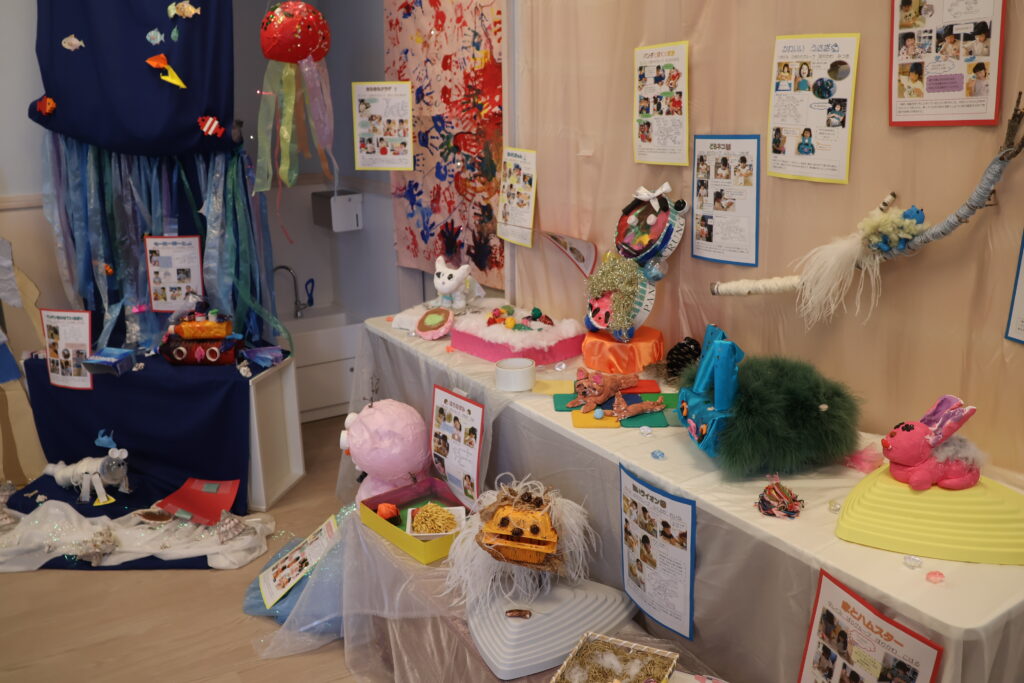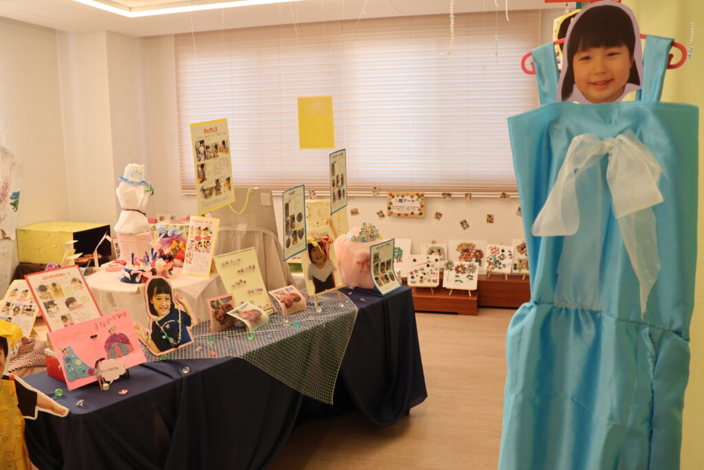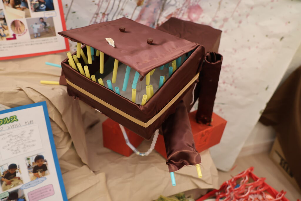 をテーマに、子どもたちは、自分で考え、試行錯誤し、自分だけの素敵な作品を作り上げました。作品の横には、一人ひとりの制作の様子の写真を貼り、制作過程をまとめたポートフォリオも一緒に展示しています。