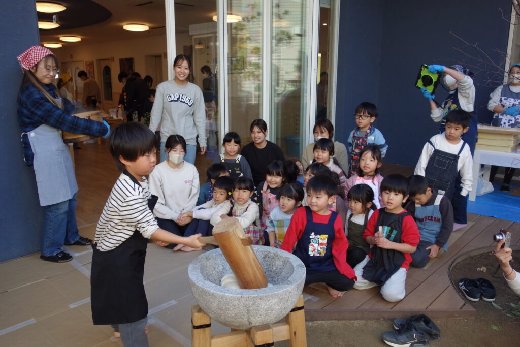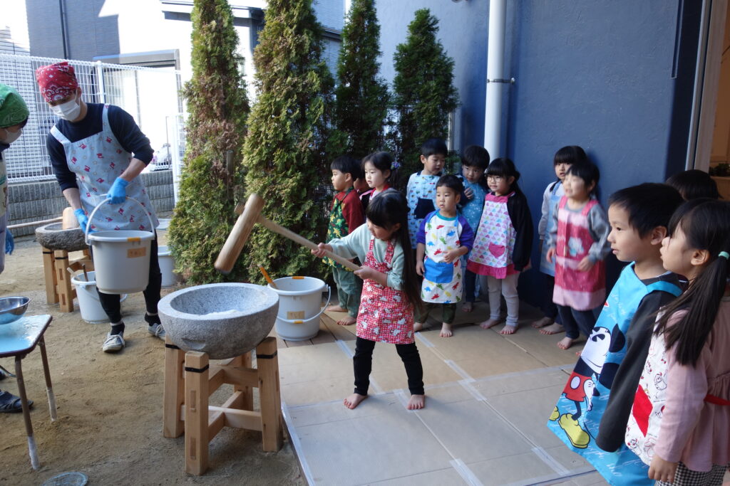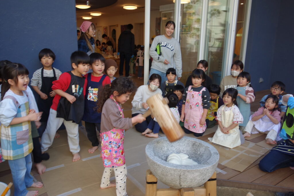 重たい杵を力いっぱい振る顔は、どの子も真剣で、友達の声援を受けながら頑張ってお餅をついていました。