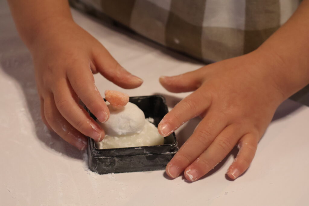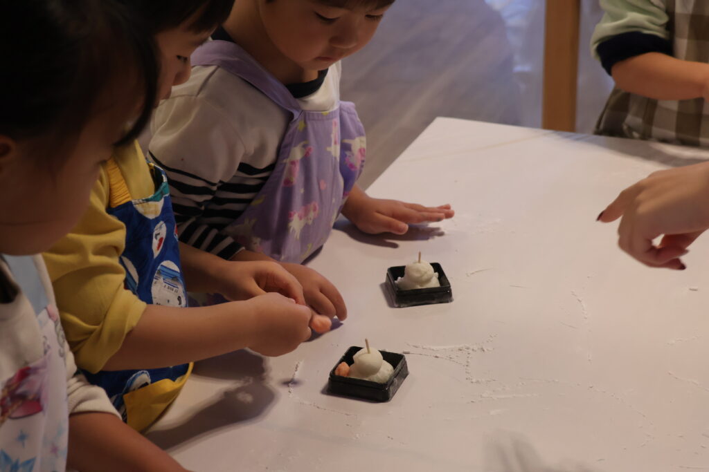 つきたてのお餅は子どもたちが丸め、1人づつ小さな鏡餅を作りお土産にお家に持ち帰りました。