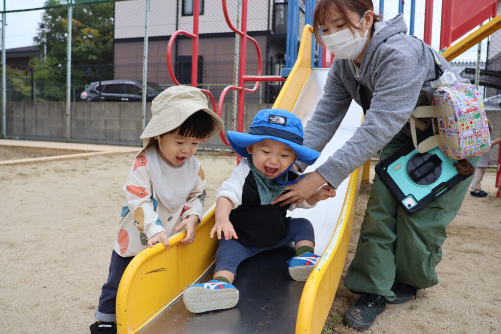 滑り台を滑り終わると笑顔が見られました。