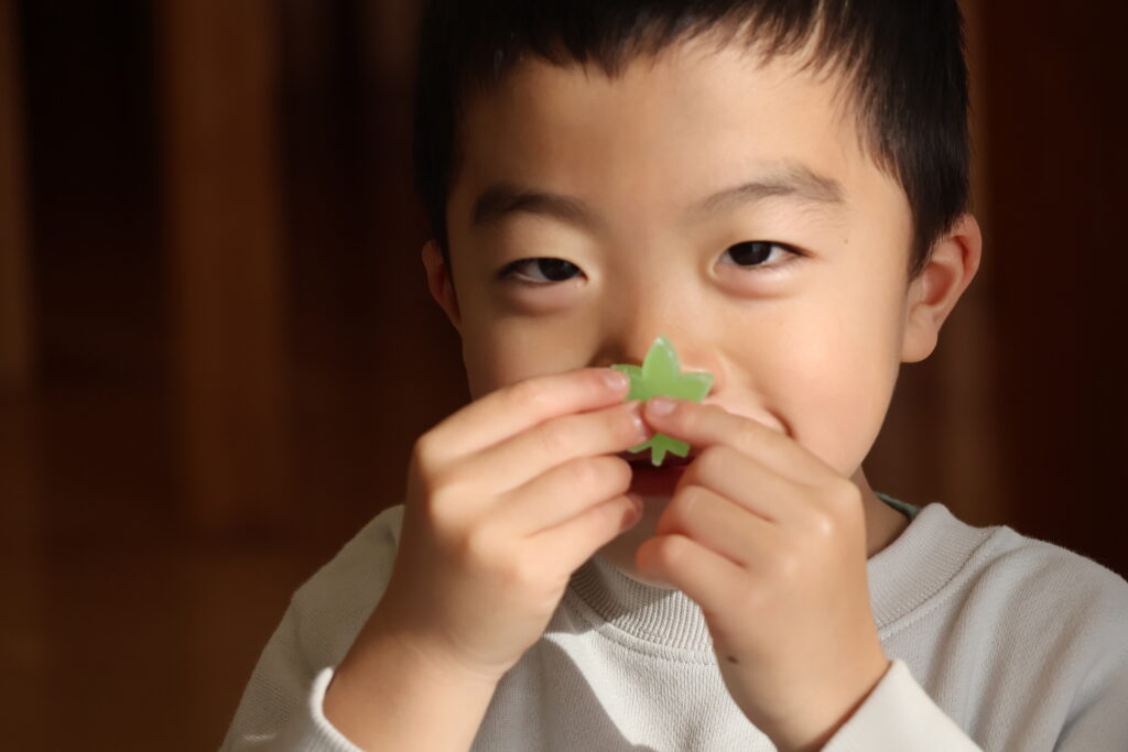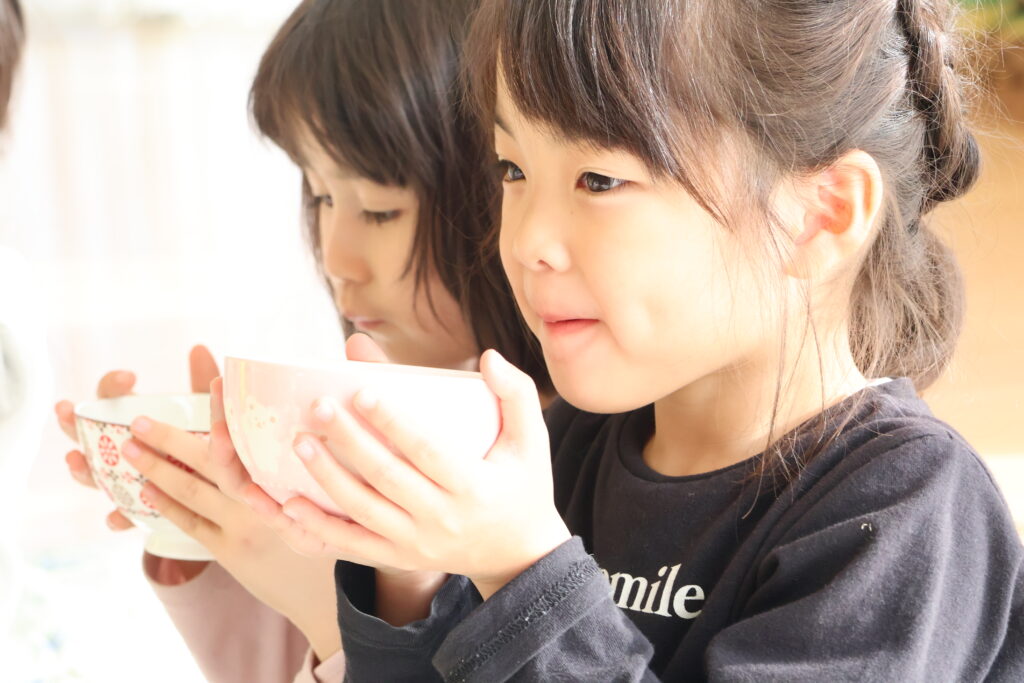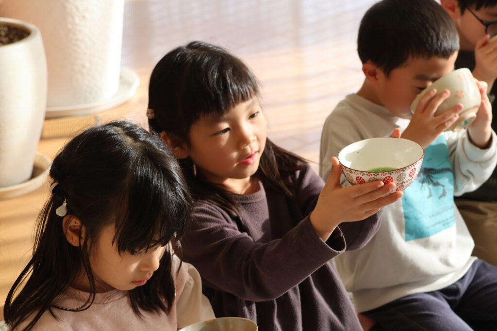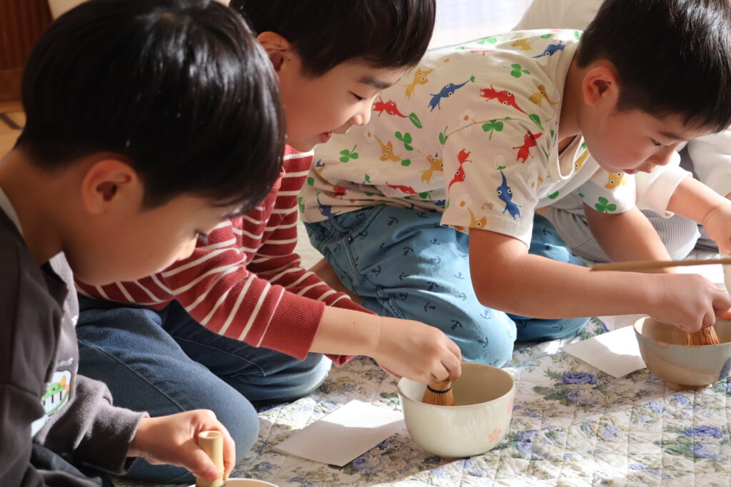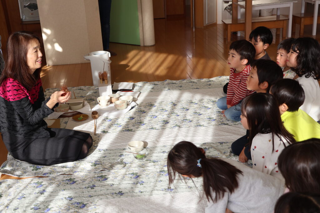 地域の方が、5歳児に日本の伝統「茶道」を教えに来てくださいました。初めて目にするお茶道具やお菓子に子どもたちは興味津々で一つひとつ道具の名前やお茶のたて方を教わりました。