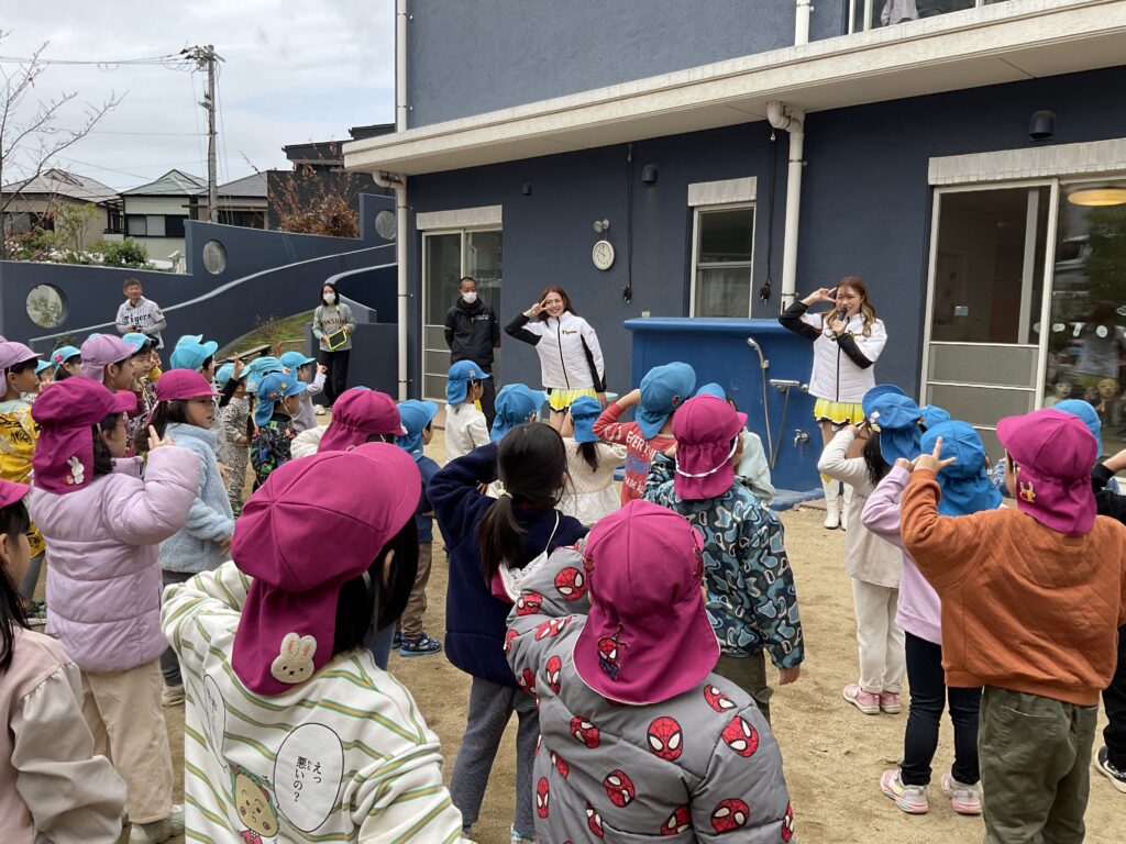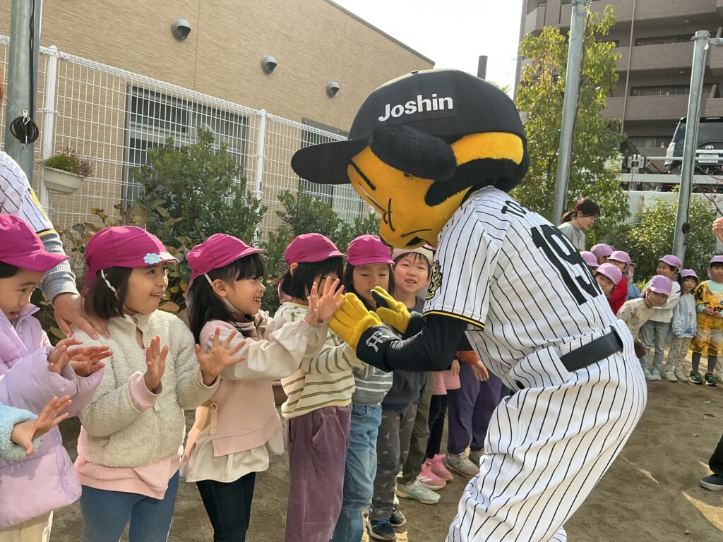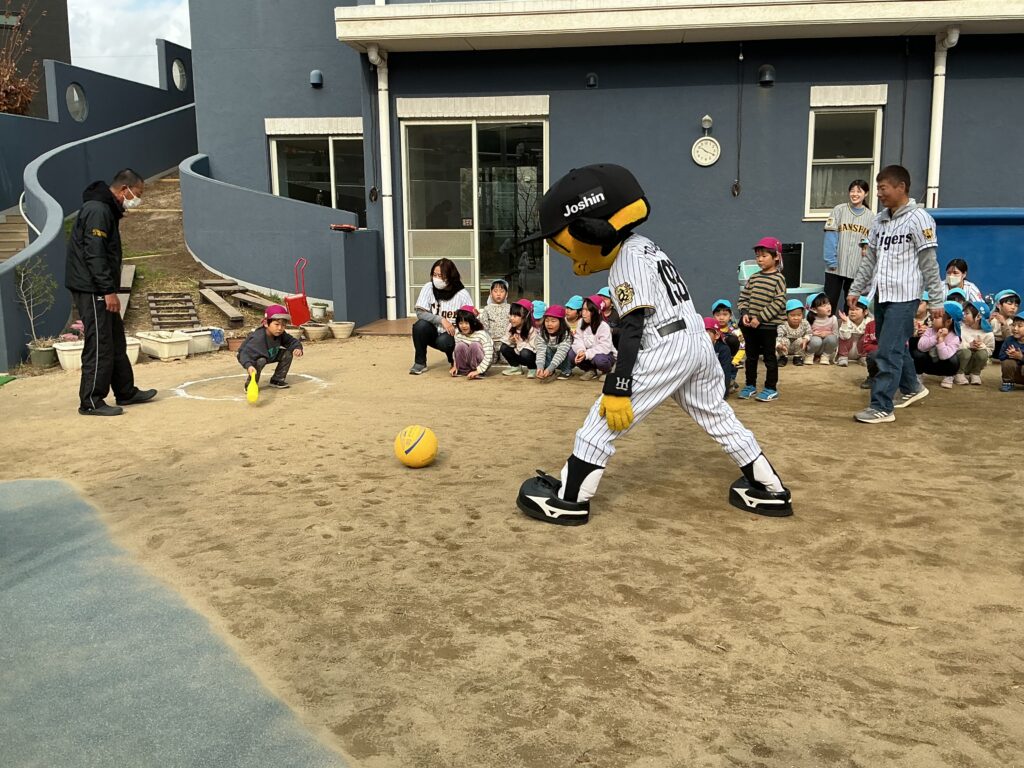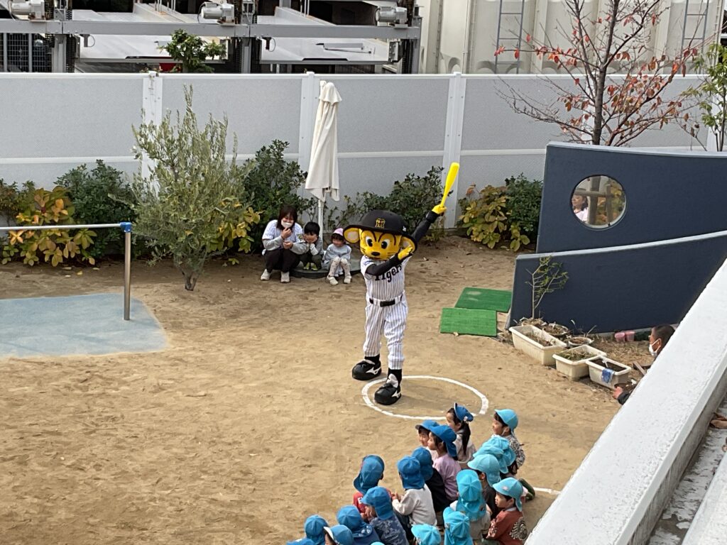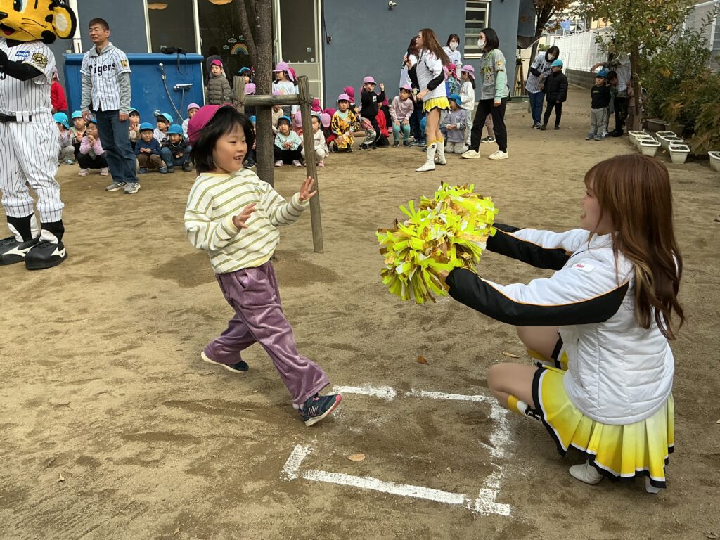 阪神タイガースの、地域の子どもたちとのふれあいイベントとして、トラッキーとタイガースガールズのAkariさん・Nakoさんが来てくれ、4.5歳児と一緒に交流の時間を持ちました。