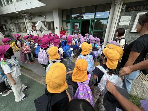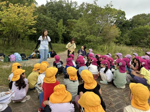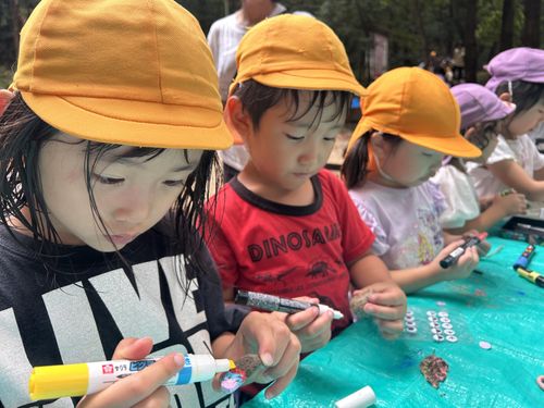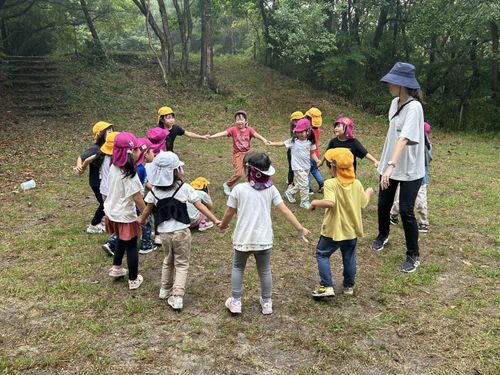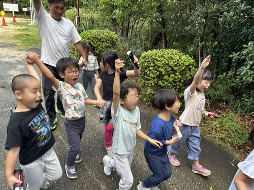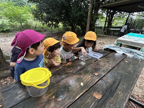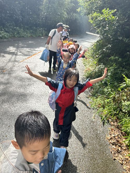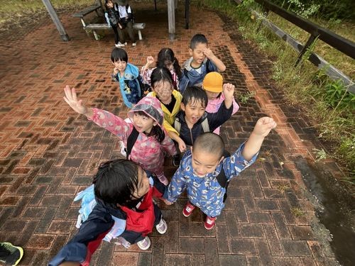 姉妹園のみどり園保育所、分園のあやはの5歳児と一緒に甲山自然の家へ宿泊保育に行きました。3園合同の交流の後は想定外の雨でしたが道々おもしろい事を探しながら出発です。